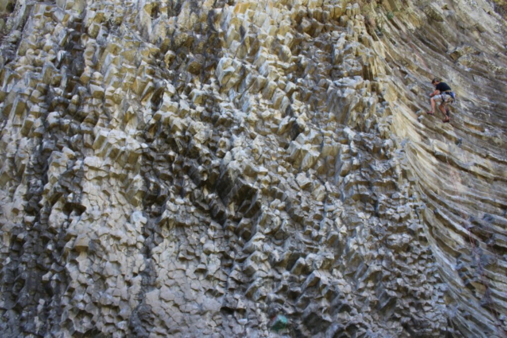 Rock climber on a wall of fractured basalt